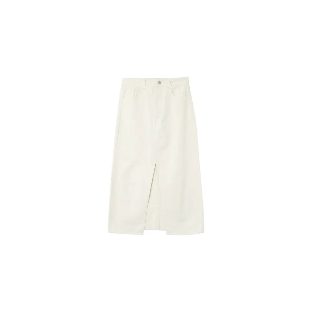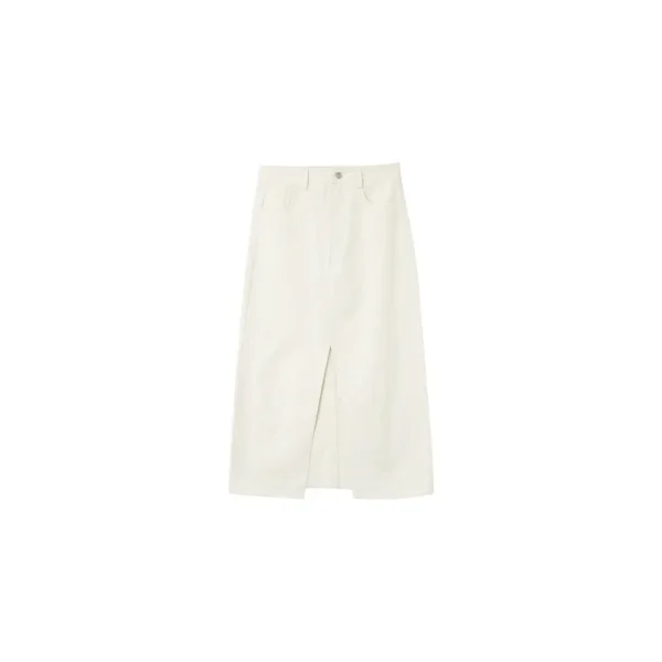 Halfhoge maxirok. 5 zakken. Rits- en haaksluiting. Riemlussen. Split in rok middenvoor. A-lijn silhouet. Recht model. Samenstelling : 100% Katoen