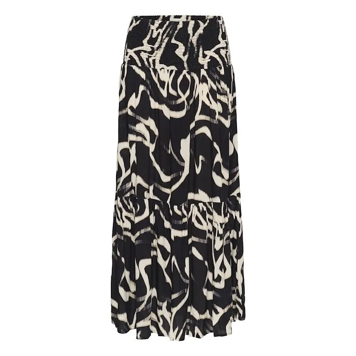 Maxirok met abstract patroon, brede gesmokte tailleband en soepel vallende, gelaagde pasvorm. Length accentueert eigentijdse stijl moeiteloos.