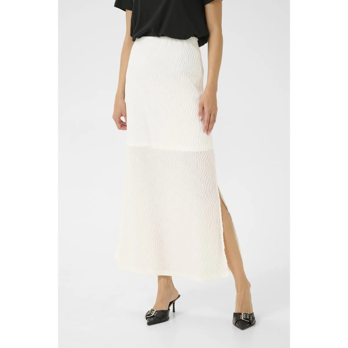 Licht rokje met een subtiele golvende textuur, biedt een hoge taille en een lengte die de enkels raakt. Inclusief een zijsplit voor gemakkelijke beweging en een verlengde silhouet.