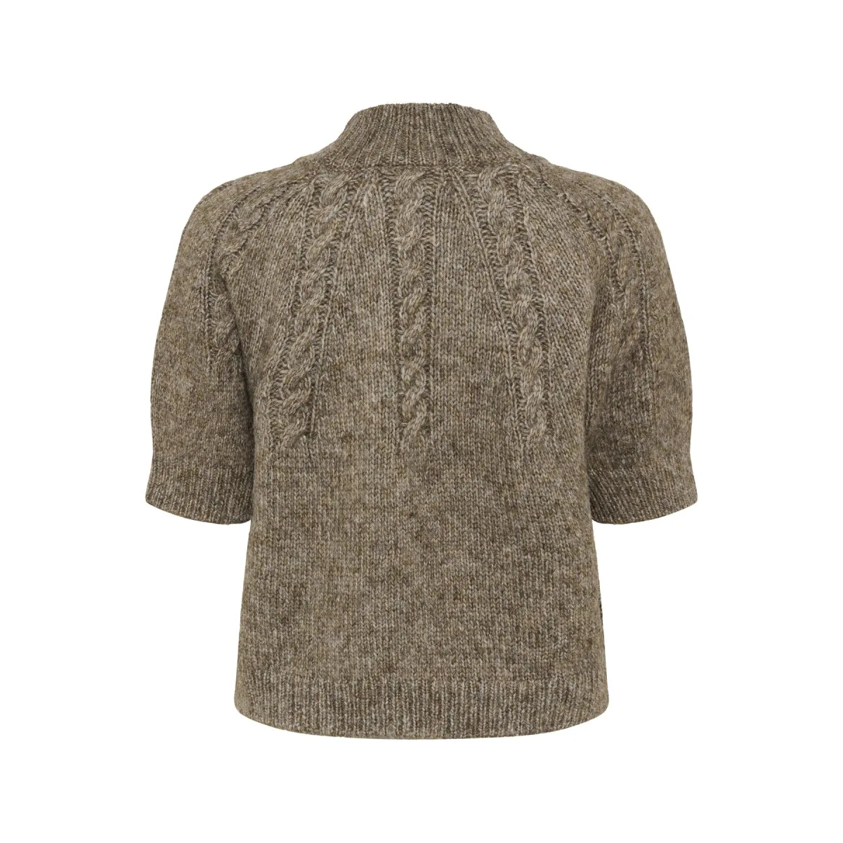 Deze kabelgebreide trui toont een boxy pasvorm, opstaande hals en korte mouwen. Ribboorden en textuur geven het ontwerp extra karakter.