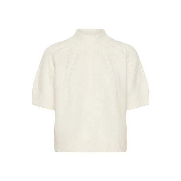 Deze kabelgebreide trui toont een boxy pasvorm, opstaande hals en korte mouwen. Ribboorden en textuur geven het ontwerp extra karakter.