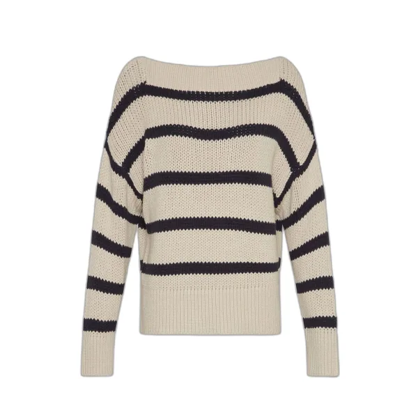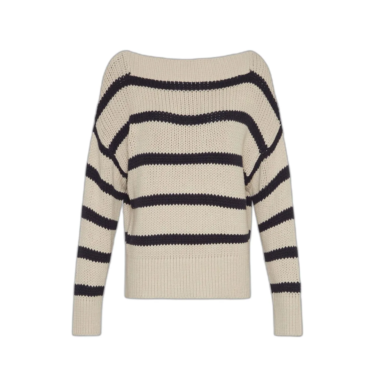 TruiOnze trui Gladis is gebreid van dikke wol en heeft een bootneck die een vleugje vrouwelijkheid aan de stijl toevoegt. De trui heeft een lage schouderlijn om de oversized look te benadrukken en toont donkerblauwe strepen.