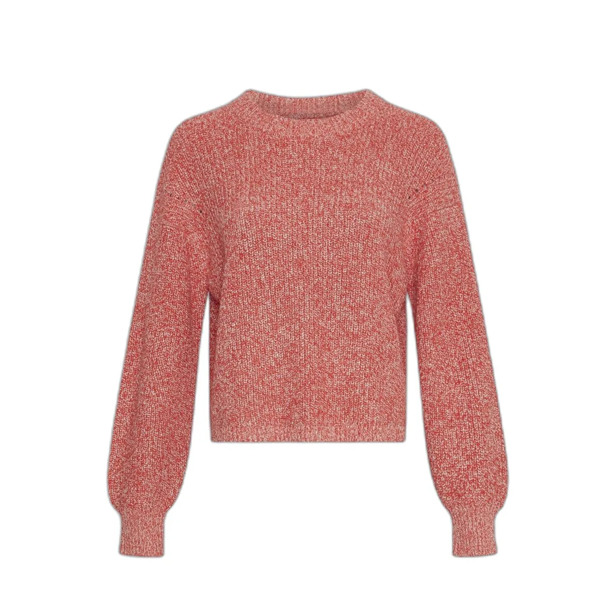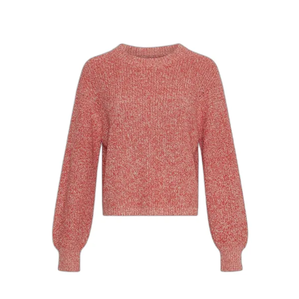 TruiEen gebreide trui met een ronde hals, een oversized schouderlijn en een brede geribde manche die een pofmouwen effect creëert. Het is een bicolor breisel met zowel een witte als een rode tint.