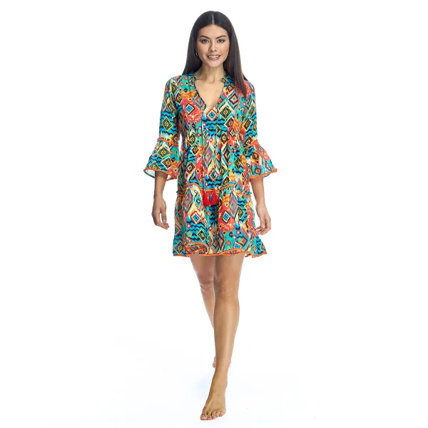 Een strandjurk die levendige prints en zorgvuldig ontworpen details combineert, is de perfecte metgezel om van de zomer te genieten in stijl en comfort. Ontworpen voor degenen die op zoek zijn naar een frisse en veelzijdige kledingstuk, valt deze korte jurk zowel op het zand als tijdens wandelingen langs de zee op. Details: - Ontspannen stijl met vrouwelijke details die perfect aanpassen aan warme klimaten. - Franse mouwen met ruffles die een elegante en casual touch toevoegen. - 'V' halslijn die slanker maakt en frisheid biedt, met decoratieve veters om aan te passen naar jouw voorkeur. - Losse pasvorm met geplooide details die beweging en comfort toevoegen. - Lichtgewicht en ademende stof met een opvallende etnische print die de essentie van de zomer vastlegt. Deze korte strandjurk is meer dan alleen een kledingstuk; het is een statement van zomerstijl. Ideaal voor zonnige dagen, garandeert het frisheid, comfort en een levendige uitstraling die niet onopgemerkt zal blijven. Samenstelling: 100% Viscose Onderhoud: Handwas. Niet bleken. Niet in de droger. Niet strijken. Niet chemisch reinigen. Niet wringen.