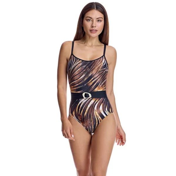Dit eendelige badpak voor dames combineert elegantie en comfort met een afslankend ontwerp dat het silhouet flatteert. De hoogwaardige materialen en zorgvuldig vervaardigde details maken het een ideaal damesbadpak om er verfijnd uit te zien op het strand of bij het zwembad.nn Details:nn - Ronde halslijn.n - Verstelbare bandjes.n - Verwijderbare cups.n - Abstract ontwerp van vloeiende lijnen.n - Lage rug met U-uitsnijding.n - Sneldrogend en chloorbestendig materiaal.n - Optimale bedekking en ondersteuning.nn We kunnen gerust zeggen dat eendelige badpakken voor dames u alles bieden wat u zoekt. Als je geïnteresseerd bent in het kopen van een stijlvol en praktisch stuk waarmee je op elk moment van het jaar kunt zwemmen, dan zijn de picozwempakken voor dames iets voor jou.nn Onze eendelige zwempakken voor vrouwen passen perfect bij elk type en elke borstomvang, zonder uitzondering.n Samenstelling: Buitenkant: 80% Polyamide, 20% Lycra; Binnenkant: 76% Polyamide, 24% Elastaan; Cup: 100% Polyestern Onderhoud:nHandwas.n Gebruik neutrale zeep.n Niet draaien of knijpen.n Aan de lucht drogen.