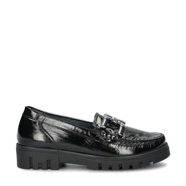 Waldläufer H-Serena dames loafer Loafers zijn weer helemaal in. Ga met deze lak variant voor ultiem comfort. Uitgevoerd in lakleer met schakel-details op de wreef. Gevoerd met leer wat met het ademend vermogen bevorderend is voor het voetklimaat. Voorzien van een leren voetbed met foam onderlaag voor optimale demping. Het voetbed is tevens uitneembaar om plaats te maken voor eigen steunzolen. Afgewerkt met grove profiel zool om de loafer een stoere uitstraling te geven. Het EVA-schuimmix werkt schokabsorberend wat optimaal comfort biedt. Deze loafer heeft een breedtemaat H wat hem geschikt maakt voor de bredere voet.