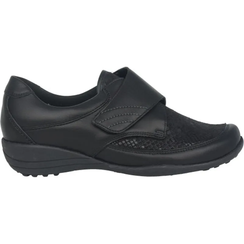 De Katja-Soft klittenbandschoen in breedte K is optimaal afgestemd op sterke voeten. In effen zwart past hij bij veel verschillende outfits. Zoals alle orthopedische modellen van Waldläufer is deze schoen flexibel in het bovenmateriaal, volgt de unieke vorm van de voet en is daarom bijzonder geschikt voor gevoelige voeten. Door middel van de klittenbandsluiting kan de schoen individueel worden aangepast aan de vorm van uw voet. Kenmerkend voor Waldläufer is het comfortabele uitneembare voetbed met luchtdemping dat vervangen kan worden door een orthopedische binnenzool.