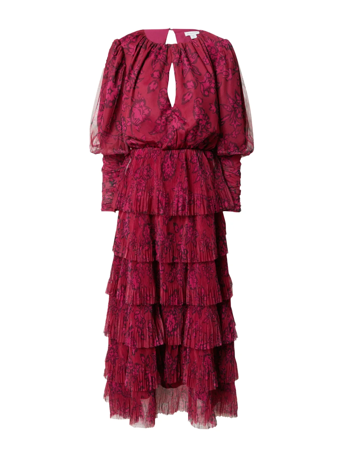 Design: Pofmouwen, Rug rits, Rug inkeep; Type sluiting: Knoopsluiting; Materiaal: Tule; Halstype: Ronde hals; Motief: Bloemenprint; Details: Cut-outs, Volant, Gedrapeerd; Extra's: Licht transparant, All-over patroon, Gladde stof; Lengte: 7/8 lengte; Pasvorm: Normale pasvorm; Armlengte: Lange mouw