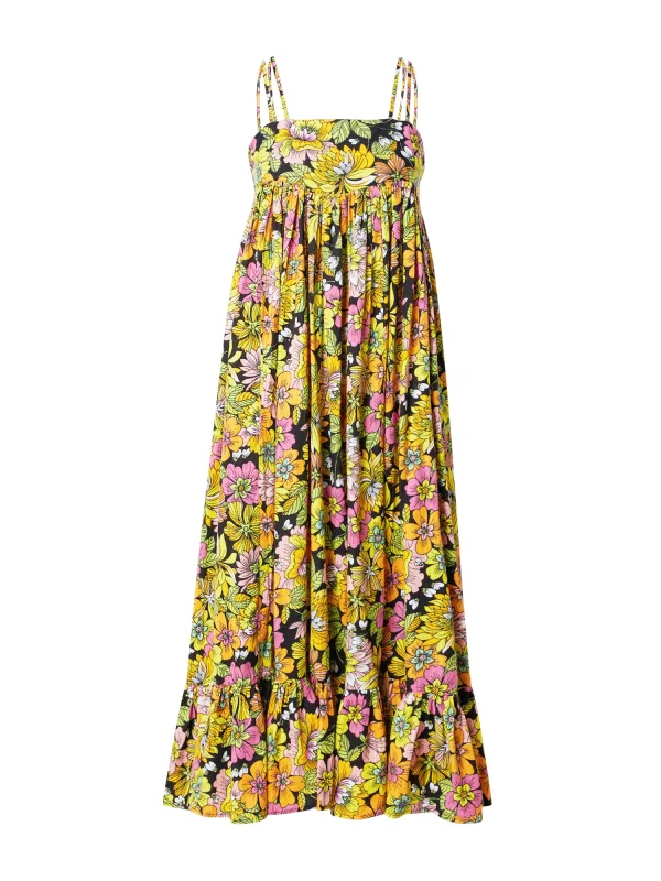 Design: Gevoerde zoom/rand, Flare; Materiaal: Katoen; Halstype: Carréhals; Motief: Bloemenprint; Soort bandjes: Spaghettibandjes; Details: Volant, Gedrapeerd; Extra's: All-over patroon, Voelt zacht aan; Lengte: 3/4 lengte; Pasvorm: Losse pasvorm; Armlengte: Mouwloos