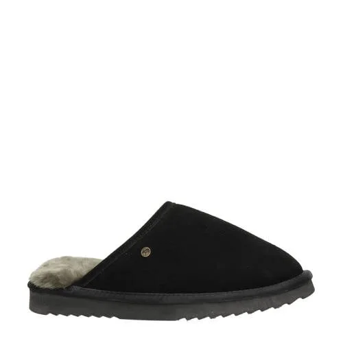 Heren pantoffel van Warmbat uit de Nelson-schoenen collectie, uitgevoerd in suéde. De pantoffel is volledig gevoerd met merino schapenvacht.
