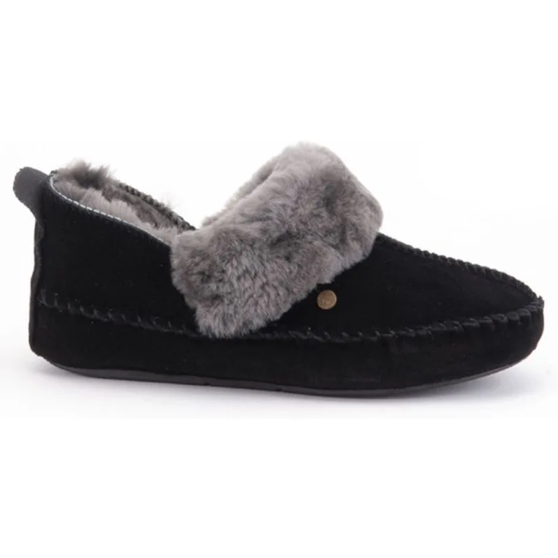 Artikel BAR 3410-Barrine in kleur 99-Black is een prachtige zwarte pantoffel met dichte hiel, voor dames, van het merk Warmbat. De zool is van rubber. De voering is bont. De voetwijdte is standaard.
