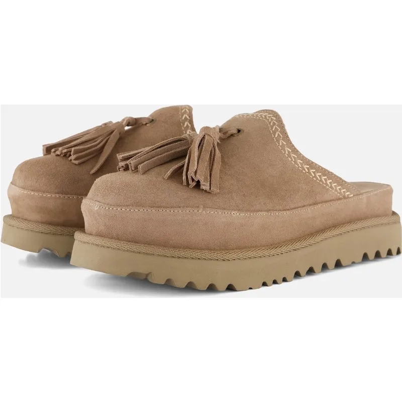 Deze taupekleurige suède muiltjes van Warmbat zijn perfect voor wie houdt van comfort met een stijlvolle twist. De speelse franjes op de wreef geven deze muiltjes een modieuze uitstraling. Dankzij het instapmodel trek je ze in één beweging aan. De rubberen zool van 2 cm biedt extra grip en loopcomfort en de textielen binnenkant voelt prettig aan de voet. Makkelijk, stijlvol en helemaal on-trend: deze Warmbat muiltjes wil je dit seizoen niet missen.