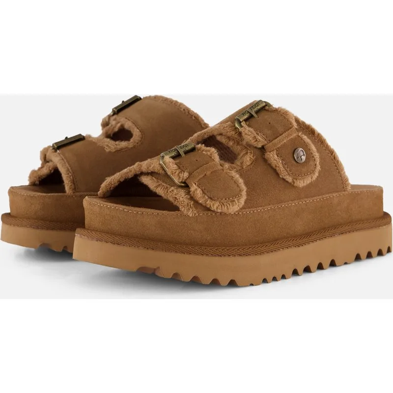 De Warmbat Dysart slippers in cognac combineren ultiem comfort met een trendy, nonchalante look. Het zachte suède bovenwerk wordt speels afgewerkt met fluffy details langs de banden, wat zorgt voor een warme en luxe uitstraling. De dubbele verstelbare gespen bieden een fijne pasvorm, terwijl het comfortabele voetbed en de lichtgewicht zool met grof profiel zorgen voor extra draaggemak en grip. Ideaal voor ontspannen dagen, zowel binnen als buiten, en perfect om je casual outfit een stijlvolle upgrade te geven.