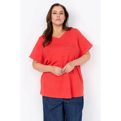 Geef je zomergarderobe kleur met dit rood dames T-shirt met V-hals van Wasabiconcept. De warme roodtint valt direct op, terwijl de V-hals en rechte mouwen zorgen voor een vrouwelijke en ontspannen uitstraling. Dankzij de soepele stof met stretch valt het T-shirt mooi om het lichaam, ideaal binnen het grote maten assortiment.Details die je elke dag aantrekt Gemaakt van 48% modal en 4% elastan voor een zachte, soepele touch met lichte stretch V-hals die het decolleté subtiel accentueert en luchtig aanvoelt in de zomer Korte, rechte mouwen voor een frisse en comfortabele look Tekstprint op de voorkant voor een moderne, vrouwelijke uitstraling Geen borstzakken, waardoor de voorkant rustig oogt Onderdeel van de 'Feminine' collectie, speciaal afgestemd op dames met een grotere maat 1 T-shirt in de verpakking, makkelijk te combineren met je bestaande kledingZomerse combinaties voor elke dagDit rode T-shirt past goed bij een lichte jeans, een zwarte broek of een rok. De luchtige stof is prettig op warme dagen, bijvoorbeeld tijdens een dagje stad, op vakantie of gewoon thuis. Draag het los over een broek of half ingestopt voor een speelse look.Wasabiconcept: moderne stijl met aandacht voor pasvormWasabiconcept richt zich op eigentijdse mode met een comfortabele pasvorm, ook in grotere maten. De ontwerpen zijn afgestemd op dagelijks dragen en sluiten aan bij actuele trends, zodat je eenvoudig een garderobe opbouwt die zowel praktisch als stijlvol is.Een T-shirt dat kleur en comfort toevoegt aan je zomerse looks.
