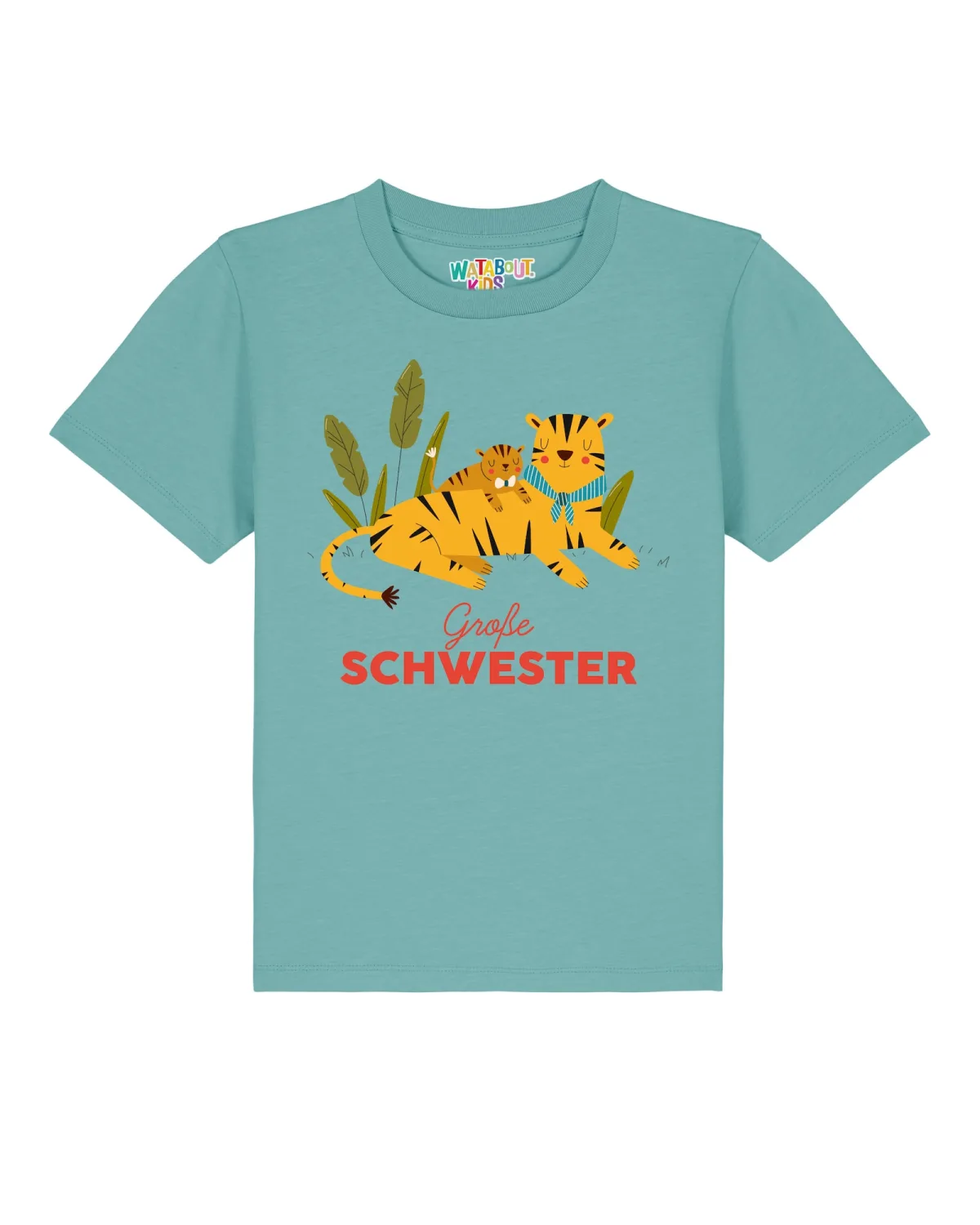 Specificaties: watabout.kids Shirt ‘ Tiger Große Schwester’ turquoise / groen / oranje / rood