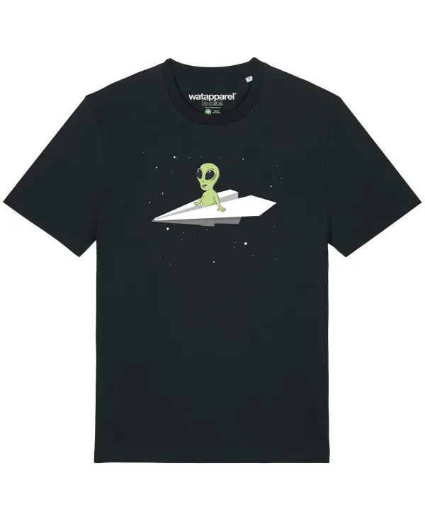 Specificaties: Watapparel Shirt ‘Alien on a paper plane’ groen / zwart / wit