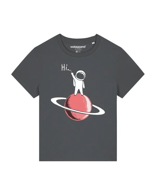 Specificaties: Watapparel Shirt ‘ Astronaut says Hi ‘ antraciet / pink / wit
