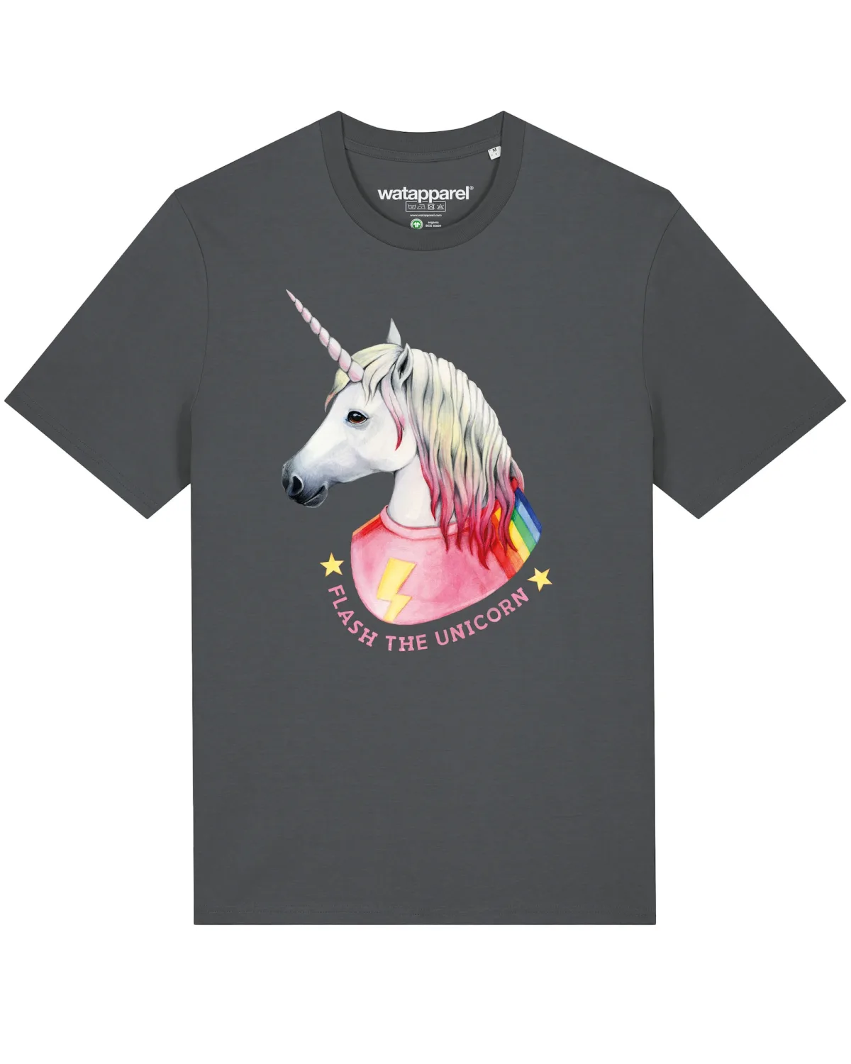Specificaties: Watapparel Shirt ‘ Flash, the unicorn ‘ antraciet / gemengde kleuren