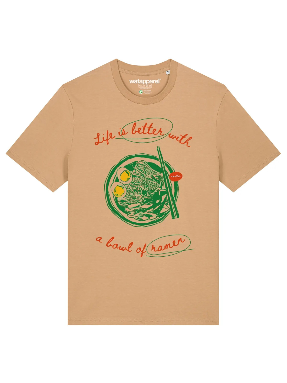 Specificaties: Watapparel Shirt ‘Life Is Better With Ramen’ camel / geel / groen / rood