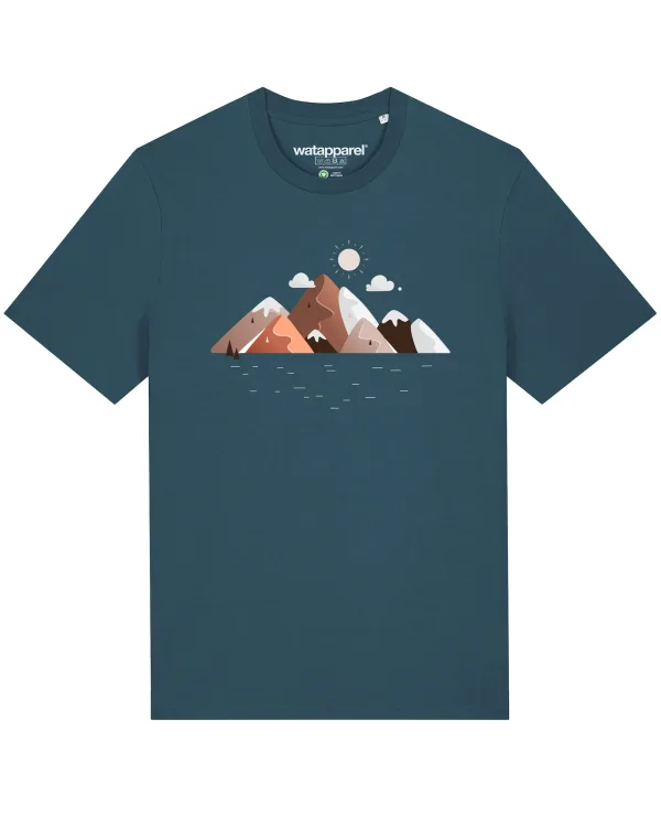 Specificaties: Watapparel Shirt ‘Mountains & Moon’ beige / petrol / oranje / wit