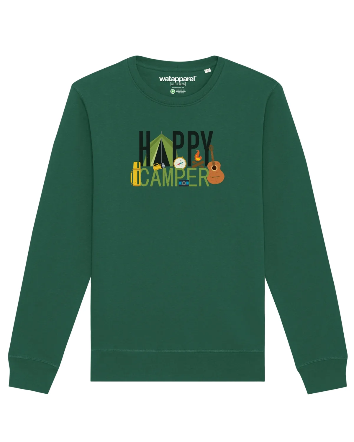 Specificaties: Watapparel Sweatshirt ‘ Happy Camper ‘ donkergroen / gemengde kleuren