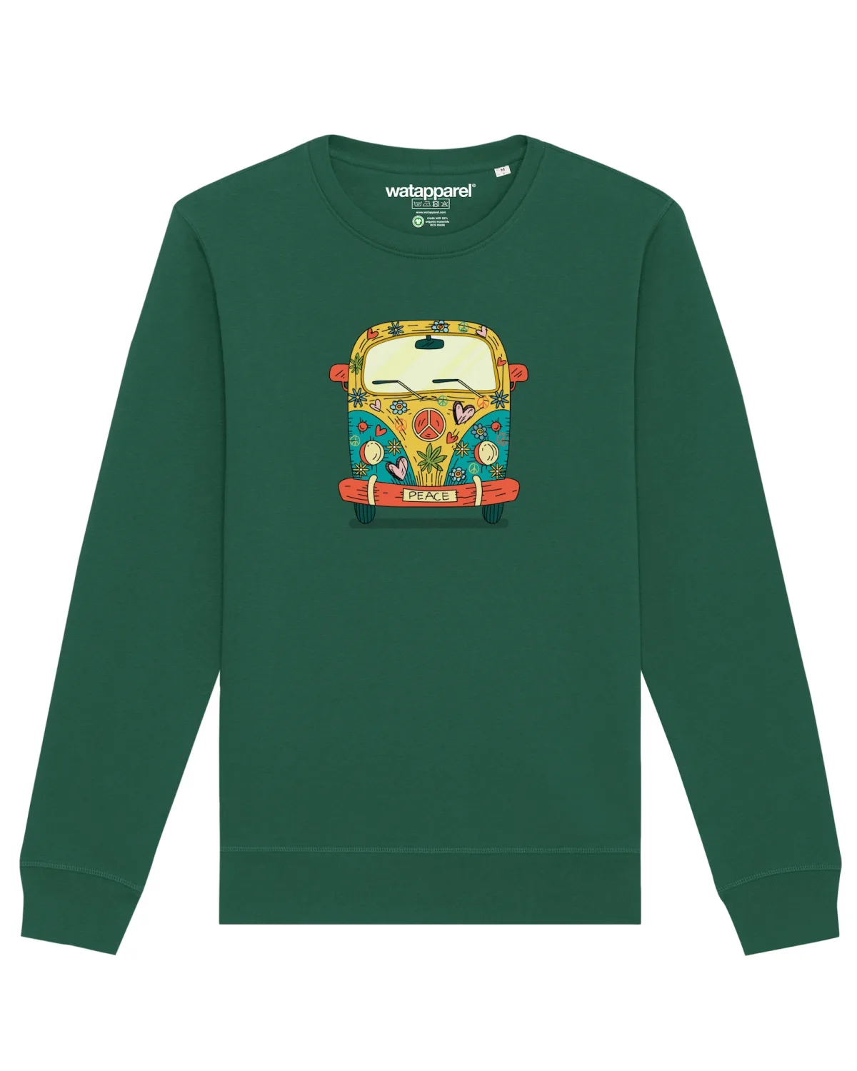 Specificaties: Watapparel Sweatshirt ‘ Hippies Bus ‘ donkergroen / gemengde kleuren