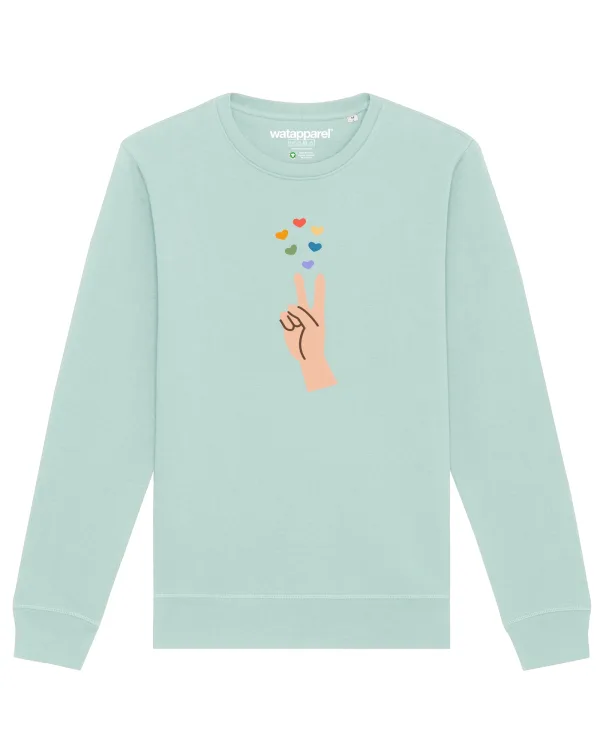 Specificaties: Watapparel Sweatshirt ‘Spread love’ hemelsblauw / gemengde kleuren