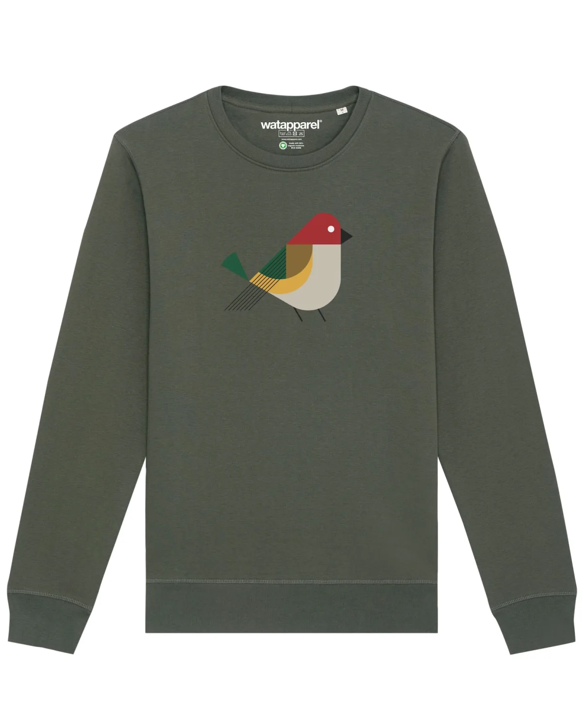 Specificaties: Watapparel Sweatshirt ‘ Vogel ‘ olijfgroen / gemengde kleuren