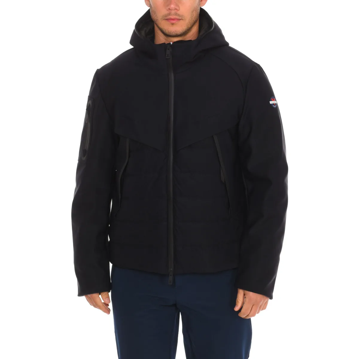 Waterdichte jas Vuarnet. Hoge kraag met capuchon. Ritssluiting in twee richtingen. Eén zak met rits op de mouw. Twee handzakken met rits Eén binnenzak met rits. Merklogo op één mouw. Samenstelling: 74% polyamide, 26% elastaan Onderhoud: Handwas. Niet strijken. Niet in de droger. Geen bleekmiddel gebruiken. Niet chemisch reinigen.