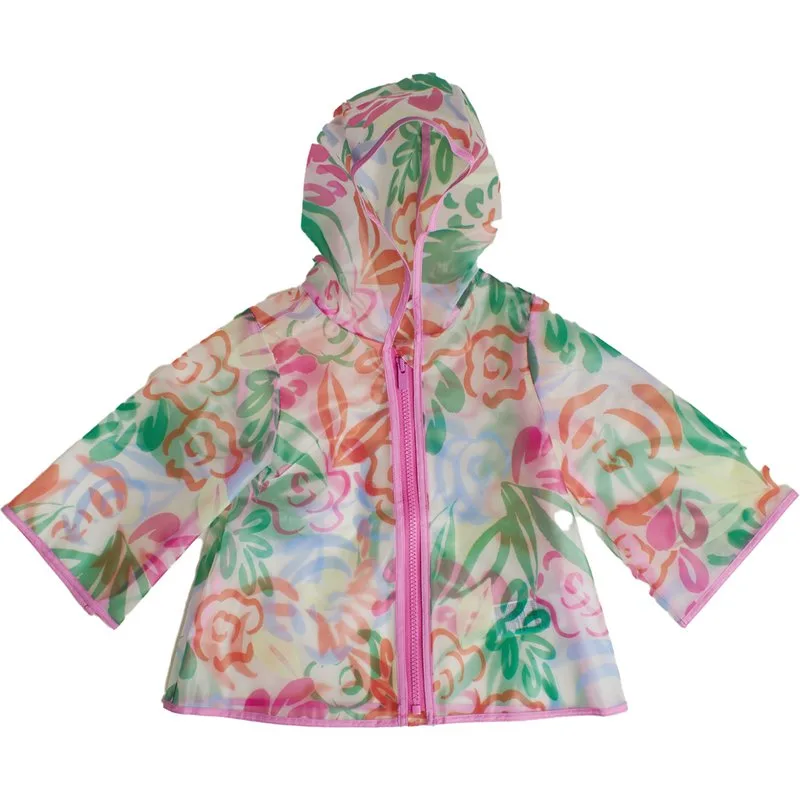 Regenjas voor meisjes met een kleurrijk en leuk ontwerp, ideaal voor regenachtige dagen. Hij is gemaakt van transparant, waterafstotend materiaal en heeft een levendige bloemenprint die de outfit een vrolijke touch geeft. Het kledingstuk heeft een capuchon voor extra bescherming en een ritssluiting aan de voorkant voor eenvoudig gebruik. De ruime mouwen en het lichte ontwerp zorgen voor bewegingsvrijheid, waardoor het een perfecte keuze is om de kleintjes droog en comfortabel te houden tijdens uitstapjes in regenachtig weer. Samenstelling: 100% polyurethaan Onderhoud: - Reinigen met een vochtige doek. - Vermijd het gebruik van een wasmachine. - Aan de lucht laten drogen. - Niet strijken of bleken.