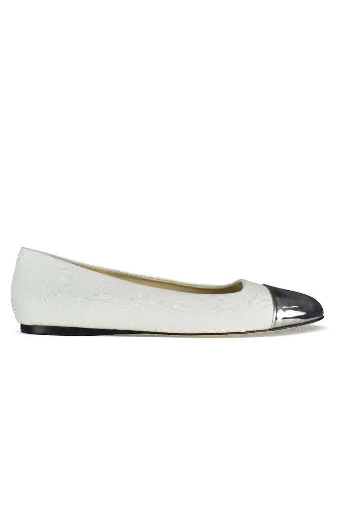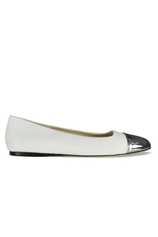 Jimmy Choo witte leren Watson platte ballerina's met structuur.Zilver metallic leer aan de voorkant.Afgeronde neus.Platte hak.Gemaakt in Italië.