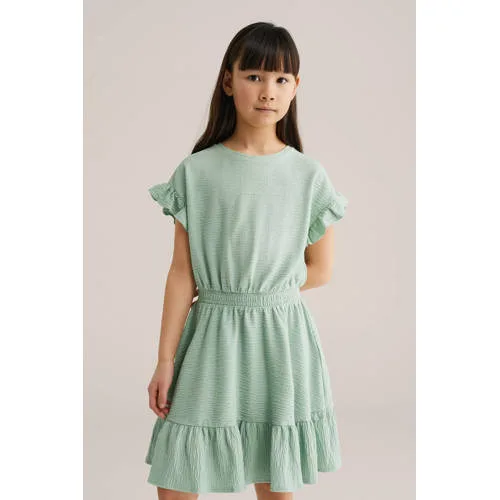 Deze WE Fashion meisjes jurk is gemaakt voor zonnige dagen en beweeglijke momenten. De luchtige seersucker stof met fijne structuur voelt licht aan en sluit niet strak aan op de huid. Dankzij de toegevoegde stretch beweegt de jurk soepel mee, of je kind nu speelt, rent of gewoon relaxed. De mintgroene kleur zorgt voor een frisse, zomerse uitstraling die makkelijk te combineren is met sandalen, sneakers of een vestje.Lichte jurk met speelse details Gemaakt van seersucker met stretch, voor een ademend en soepel draaggevoel Regular fit met A-lijn pasvorm voor fijne bewegingsvrijheid Korte mouwen met ruches voor een speels effect Elastische tailleband die zorgt voor een mooie, comfortabele taille Volantboord aan de onderkant voor extra zwier in de rok Effen mintgroene kleur, makkelijk te stylen voor elke dag Zonder sluiting, zodat de jurk eenvoudig aan en uit gaat Gemaakt van 91% katoen, 8% polyester en 1% elastaanZomerse favoriet in één stapDeze jurk is ideaal als snelle outfit voor school, een dagje buiten of een feestje. Door de elastische taille en het ontbreken van een sluiting is aankleden zo gedaan. Met een spijkerjasje of vest erbij past de jurk ook goed op wat frissere dagen.Vertrouwde stijl van WE FashionWE Fashion staat bekend om toegankelijke mode met aandacht voor pasvorm en detail. Deze meisjes jurk sluit daar naadloos op aan, met een prettig draaggevoel en een doordacht ontwerp dat past bij het dagelijks leven van kinderen.Een lichte, speelse jurk waar je kind de hele zomer plezier van heeft.