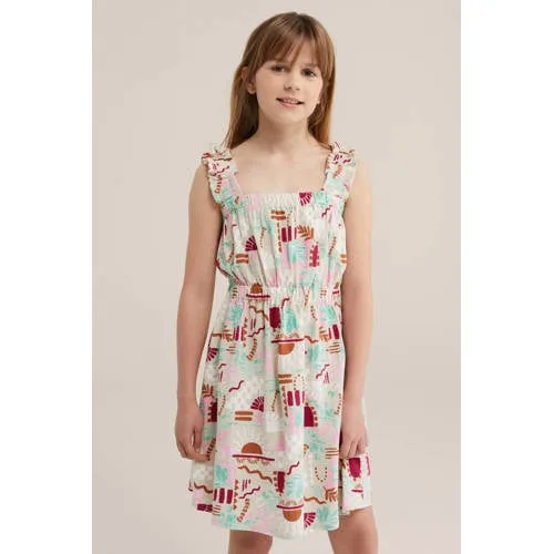 Deze zomerse meisjes jurk van katoen is gemaakt voor zonnige dagen vol beweging en speelplezier. De seersuckerstof heeft een lichte, gewafelde structuur die luchtig aanvoelt op de huid. De all-over print met zonnetjes en tropische details komt mooi uit op de ivoor kleur en geeft de jurk een vrolijke uitstraling. De A-lijn pasvorm valt soepel om het lichaam en biedt genoeg ruimte om vrij te bewegen.Speelse details voor elke dag Gemaakt van 100% katoen, voelt zacht en comfortabel aan op de huid Seersuckerstructuur zorgt voor een luchtig en licht gevoel tijdens warme dagen Vierkante, elastische halslijn en elastische schouderbandjes voor een goede aansluiting Elastische taille die de A-lijn mooi laat uitkomen Golvende afwerking langs de onderkant voor een speelse look All-over print met zonnetjes en tropische details in frisse kleuren Mouwloos ontwerp, ideaal voor lente en zomer Geen sluiting, de jurk wordt eenvoudig over het hoofd aangetrokkenComfortabel in elke speelsituatieDeze jurk past goed bij dagelijks gebruik, van schooldag tot speeltuin. In combinatie met sandalen of sneakers en een licht vest is de outfit makkelijk aan te passen aan het weer.WE Fashion voor kidsWE Fashion ontwerpt kinderkleding die past bij het dagelijks leven van actieve kinderen. De collecties combineren draagbaar design met doordachte details en comfortabele pasvormen, zodat kinderen zich vrij kunnen bewegen en ouders kunnen rekenen op betrouwbare kwaliteit.Een luchtige jurk die klaar is voor zonnige dagen en alledaagse momenten.
