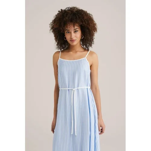 Deze jurk van WE Fashion heeft een lange A-lijn en spaghetti bandjes. De vierkante hals zorgt voor een opvallende look. De viscose stof voelt zacht aan en de ceintuur accentueert de taille. Verstelbare bandjes voor extra comfort.