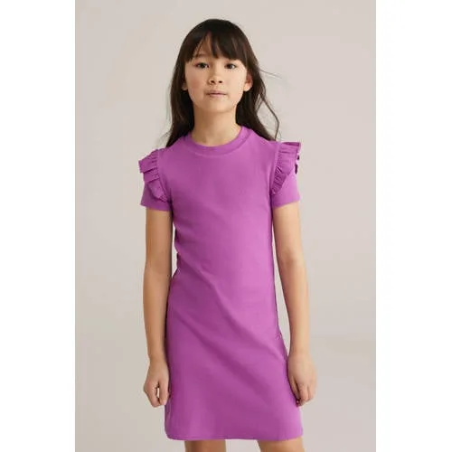 Speels, zacht en klaar voor elke drukke dag: deze WE Fashion meisjes jurk van ribstof is gemaakt om vaak te dragen. De jurk heeft een regular fit, een ronde hals en korte mouwen met ruches voor een subtiele, speelse touch. Door de stretch in de stof sluit de jurk soepel aan, zonder in te leveren op bewegingsvrijheid. De korte lengte zorgt voor een frisse, vrolijke uitstraling die goed past bij het dagelijks spelen, naar school gaan of een gezellige dag uit.Handige details voor elke dag Gemaakt van 95% katoen en 5% elastaan, waardoor de stof zacht aanvoelt en licht meerekt Ribstructuur geeft een moderne, iets sportieve look Regular fit met A-lijn, comfortabel om in te bewegen Korte mouwen met ruches voor een extra speels detail Ronde hals zonder sluiting, eenvoudig aan en uit te trekken Effen paarse kleur, makkelijk te combineren met sneakers, sandalen of een vest Geen zakken voor een rustige, gestroomlijnde vormEen jurk die gewoon mee kan in het dagelijks levenDeze jurk is ideaal voor alle momenten waarop het snel en makkelijk mag zijn. Even aantrekken, een paar favoriete schoenen erbij en klaar. De soepele ribstof beweegt prettig mee tijdens rennen, klimmen en spelen, terwijl de korte lengte luchtig aanvoelt op warmere dagen.WE Fashion voor het hele gezinWE Fashion staat bekend om moderne, toegankelijke kleding voor het hele gezin. De collecties combineren eigentijdse designs met draagbare pasvormen en heldere kleuren. Zo wordt het eenvoudig om kleding te kiezen die fijn voelt, goed staat en dag in dag uit gedragen kan worden.Een fijne basisjurk die elke dag opnieuw uit de kast gepakt kan worden.