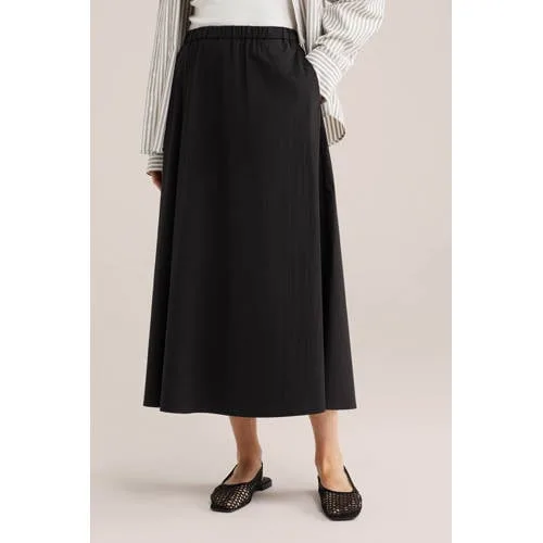 Deze zwarte dames midi rok is een item dat je vaak uit de kast pakt. De rok heeft een middelhoge, elastische taille die prettig aansluit, een A-lijn en valt tot halverwege de kuit. Dat geeft een natuurlijke vorm en genoeg bewegingsvrijheid, of je nu naar je werk gaat, een lunchafspraak hebt of met de kinderen op pad bent.Verzorgde look met dagelijks comfort Midi lengte met A-lijn voor een silhouet dat soepel om je heen valt Elastische tailleband voor snel aankleden en een comfortabele pasvorm Zijzakken voor het praktisch opbergen van kleine spullen Gemaakt van katoen met toevoeging van nylon en elastaan voor een zachte touch en lichte stretch Effen zwarte kleur die goed te combineren is met tops, blouses en T-shirts Regular fit, geschikt voor dagelijks dragen in het zomerseizoenMakkelijk combineren in jouw dagelijkse garderobeDeze rok past goed in je dagelijkse garderobe. Combineer met een eenvoudig T-shirt en sneakers voor een dag onderweg, of kies een blouse en sandalen als je een meer verzorgde look wilt. De zwarte kleur maakt het eenvoudig om te wisselen tussen casual en iets netter.WE Fashion voor alledaagse stijlWE Fashion ontwerpt kleding die toegankelijk en stijlvol is, met aandacht voor pasvorm en draaggemak. De collecties sluiten aan op het leven van alledag, zodat je met weinig moeite een samenhangende garderobe opbouwt.Een rok die jouw zomerse outfits in één keer een rustige en verzorgde basis geeft.