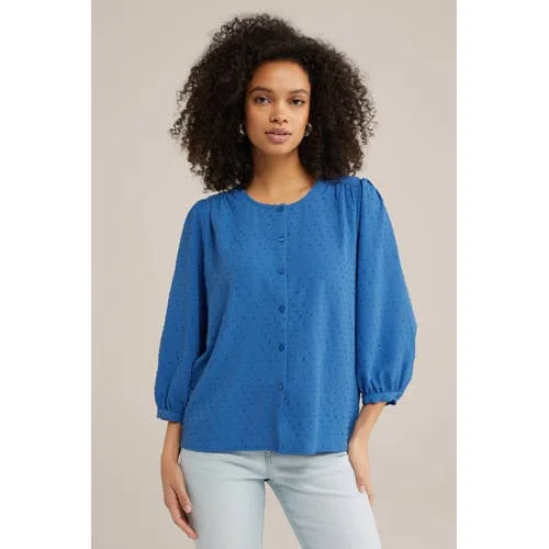 Deze damesblouse van WE Fashion heeft een moderne uitstraling. Gemaakt van jersey met een mao kraag en een stijlvolle knoopsluiting. De blouse heeft driekwart mouwen en een prachtige textuur in de stof verwerkt.