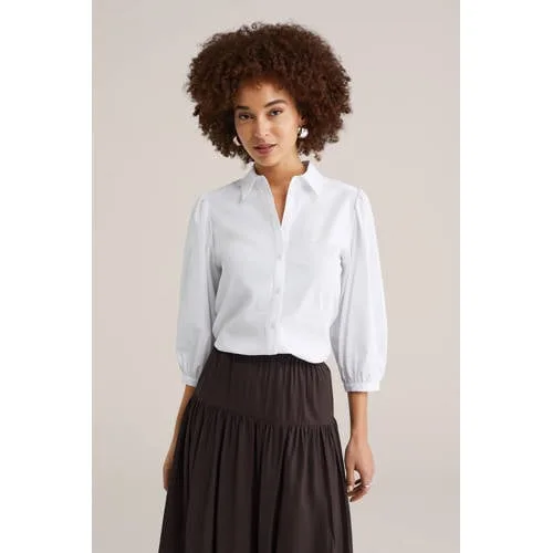 Je garderobe een frisse update geven gaat moeiteloos met deze WE Fashion blouse dames. De blouse heeft een regular fit en een klassieke kraag, waardoor het model netjes valt, maar toch relaxed oogt. De knoopsluiting over de hele lengte maakt aan- en uittrekken eenvoudig, terwijl de driekwart ballonmouwen met plooien zorgen voor een modern, vrouwelijk silhouet. Door de stretch in de stof beweegt de blouse prettig met je mee, zowel tijdens een werkdag als in je vrije tijd.Details die elke dag kloppen Regular fit voor een comfortabele, niet te strakke pasvorm Klassieke kraag en knoopsluiting voor een verzorgde uitstraling Driekwart ballonmouwen met plooien voor een eigentijdse look Gemaakt van 97% katoen en 3% elastaan voor lichte stretch Effen kleur, makkelijk te combineren met jeans, rok of pantalon Geen borstzakken voor een rustige, strakke voorkantEenvoudig combineren van kantoor tot casualDeze blouse past bij veel momenten op de dag. Naar je werk onder een blazer of vest, in het weekend op een ontspannen jeans, of netjes in een pantalon voor een etentje. De driekwart mouwen geven lucht en ruimte, terwijl de ballonvorm net dat beetje extra geeft aan een simpele outfit.WE Fashion, dagelijks draagbare stijlWE Fashion staat bekend om kleding die goed aansluit bij het dagelijks leven, met aandacht voor pasvorm, comfort en een moderne uitstraling. Deze blouse is daar een goed voorbeeld van: gemakkelijk te dragen, makkelijk te combineren en geschikt voor veel gelegenheden.Een stijlvolle basis waar je het hele seizoen plezier van hebt.