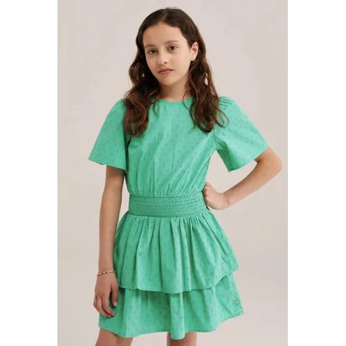 Deze meisjes jurk van WE Fashion is gemaakt voor dagen vol bewegen, spelen en genieten. De jurk heeft een regular fit met een ronde hals en korte, iets wijdere mouwen. In de taille zit een smock die zacht aansluit op het lichaam en zorgt voor een comfortabele pasvorm. De rok bestaat uit meerdere lagen met volants die bij elke stap soepel meebewegen. De stof heeft een subtiele all-over stipjesstructuur, waardoor de effen kleur net wat meer diepte krijgt. Op de rug sluit de jurk met een knoopsluiting.Details die het verschil maken Gemaakt van 100% katoen, voelt zacht en luchtig aan op de huid Smock in de taille voor een soepele pasvorm die goed blijft zitten Ronde hals en korte, wijde mouwen voor extra bewegingsvrijheid Rok met lagen en volants voor een speels, zwierig effect Knoopsluiting op de rug om makkelijk aan en uit te trekken Geschikt voor peuters, kleuters, schoolkinderen en tieners Geen zakken voor een rustige, nette lookElke dag draagbaarDeze jurk past goed in de dagelijkse garderobe. Combineer met sandalen of sneakers voor school of opvang, en met een fijn vest voor koelere dagen. De soepele stof en zwierige rok maken de jurk prettig om de hele dag te dragen.WE Fashion voor kinderenWE Fashion ontwerpt kinderkleding met aandacht voor pasvorm, draaggemak en een moderne uitstraling. De collecties sluiten aan op het dagelijkse leven van kinderen, met items die makkelijk te combineren zijn en er verzorgd uitzien.Een comfortabele jurk die er verzorgd uitziet en waar kinderen zich vrij in kunnen bewegen.