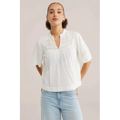 Luchtig op kantoor, fijn op een terrasje, deze witte WE Fashion dames blouse is een rustige basis met iets extra’s. De rechte pasvorm valt soepel langs je lichaam, terwijl de ronde hals met ruches en subtiele V-opening zorgt voor een verfijnde look. De opengewerkte broderie-details geven de blouse een zachte, vrouwelijke uitstraling, zonder dat het te druk wordt.Verfijnde details voor elke dag Rechte pasvorm voor een ontspannen, niet aangesloten silhouet Ronde hals met ruches en V-opening voor een sierlijke halslijn Korte, rechte mouwen die luchtig aanvoelen op je huid Opengewerkte broderie voor een subtiel speels effect Effen witte kleur, gemakkelijk te combineren met je garderobe Gemaakt van 100 procent katoen, voelt zacht en ademend aan Geen zakken voor een rustige, cleane uitstraling Ideaal voor het lente seizoen en dagelijkse outfitsEen blouse voor warme dagen en nette momentenOp een warme dag draag je deze blousetop eenvoudig op een korte broek of lichte jeans. Voor een nettere gelegenheid combineer je de blouse met een broek met hoge taille of een rok. De luchtige katoenkwaliteit en korte mouwen zorgen dat je je prettig voelt, ook als het buiten warmer is.Stijl volgens WE FashionWE Fashion staat bekend om toegankelijke mode met een moderne uitstraling. De collecties sluiten aan op wat je elke dag nodig hebt, van werk tot weekend. Met deze blouse haal je een betrouwbaar basisstuk in huis dat past bij de actuele trends en toch tijdloos oogt.Een frisse, lichte top die je snel uit de kast pakt voor zowel casual als verzorgde looks.