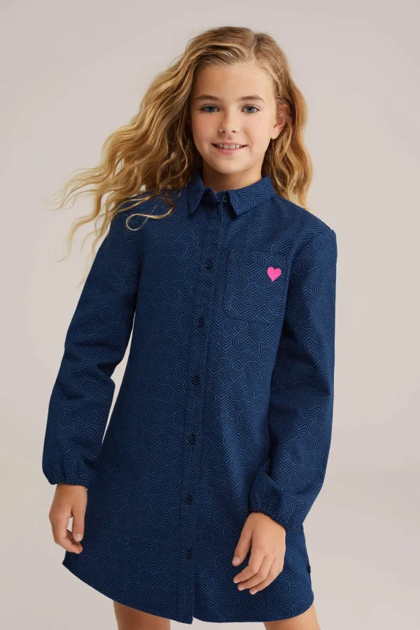 Deze WE Fashion Blue Ridge jurk heeft lange rechte mouwen en een klassieke kraag. De jurk is gemaakt van 100% katoen, heeft een knoopsluiting, een borstzak en een elastische boord.