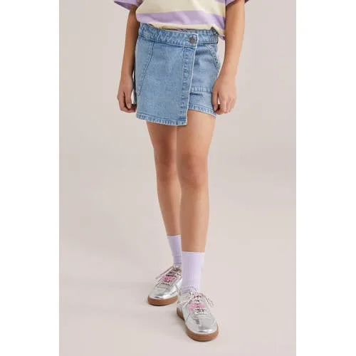 Lijkt het op een rokje, maar voelt het als een broek, dan is het deze meisjes denim skort van WE Fashion. Geschikt voor meisjes die graag vrij bewegen, maar wel van een stijlvolle denim look houden. De skort heeft een regular fit en komt in een lichte blue denim kleur, die makkelijk te combineren is met T-shirts, blouses en truien.Praktische details in denim look Skortmodel: voorkant als rok, binnenkant met broekje voor extra bewegingsvrijheid Regular fit voor een comfortabele pasvorm in het dagelijks leven Rits- en knoopsluiting aan de voorkant voor gemakkelijk aan- en uittrekken Vaste voorflap met knoop die het rokje-effect geeft Zakken voor en achter, precies op de plekken waar je ze verwacht Gemaakt van een zachte katoenmix met een beetje stretch voor een soepele feel Inclusief bijpassende scrunchie voor een afgestemde lookVoor drukke dagen vol spel en plezierDeze skort is geschikt voor peuters, kleuters, schoolkinderen en tieners en past daardoor goed in de dagelijkse garderobe. Handig voor speelafspraken, schooldagen en weekenduitjes, omdat de short aan de binnenkant ervoor zorgt dat springen, rennen en fietsen gemakkelijk kan.WE Fashion voor kidsWE Fashion staat bekend om toegankelijke collecties voor het hele gezin met doordachte basics en trendy items. Kinderkleding van WE Fashion is ontworpen met aandacht voor pasvorm, draagcomfort en een moderne uitstraling, zodat elke dag makkelijk en stijlvol begint.Een denim skort die eruitziet als een rok en beweegt als een broek, geschikt voor actieve meisjes.