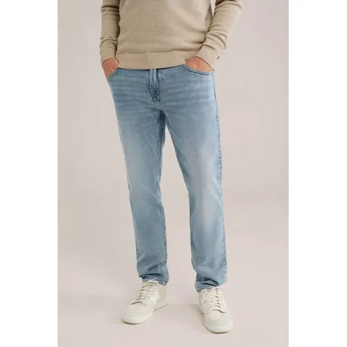 Deze slim fit jeans voor heren van WE Fashion is gemaakt van denim. Uitgevoerd in een light blue denim kleur. Voorzien van 5-pocket ontwerp en een rits- en knoopsluiting. Gemaakt van 98% katoen en 2% elastaan.