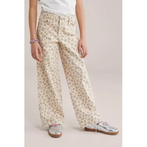 Deze WE Fashion wide leg jeans voor meisjes combineert een comfortabele pasvorm met een speelse uitstraling. De high waist, lange pijpen en het klassieke 5-pocket ontwerp geven de broek een eigentijdse basis. De denim is beige van kleur en valt op door de all-over luipaardprint in ecru met bruine en lila vlekken. Zo krijgt elke outfit direct een herkenbare stijl, of ze nu naar school gaat of een dagje uit.Details die het verschil maken Wide leg pasvorm met lange pijpen voor een moderne, losse look High waist model dat comfortabel aansluit in de taille All-over luipaardprint op ecru met bruine en lila vlekken voor een speels effect Gemaakt van 99% katoen en 1% elastaan, waardoor de jeans zacht aanvoelt en licht meebeweegt 5-pocket model met riemlussen, geschikt voor een riem Rits- en knoopsluiting die stevig sluit en makkelijk te openen isGeschikt voor elke dagDeze wide leg jeans is geschikt voor dagelijks gebruik, van schooldagen tot speelafspraken. De losse pijpen en de hoge taille geven voldoende bewegingsvrijheid tijdens rennen, spelen en fietsen. Door de opvallende print past de broek zowel bij rustige basics als bij kleding met meer kleur.Waarom kiezen voor WE FashionWE Fashion ontwerpt eigentijdse kleding met een praktische pasvorm voor kinderen. De modellen zijn afgestemd op actief dagelijks gebruik en bieden voldoende ruimte om te bewegen. Deze jeans sluit daar goed bij aan, met aandacht voor comfort, bewegingsvrijheid en een doordacht ontwerp.Een comfortabele jeans met een uitgesproken print, passend bij alledaagse momenten.