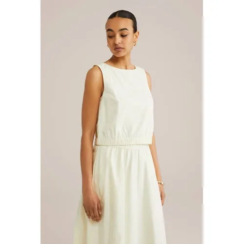 Een item dat je zonder nadenken met plezier uit je kast trekt. Deze mouwloze top heeft een dubbele laag, een elastische boord en een knoopsluiting op de rug. Perfect te combineren met de bijpassende midi-rok voor een modieuze look.