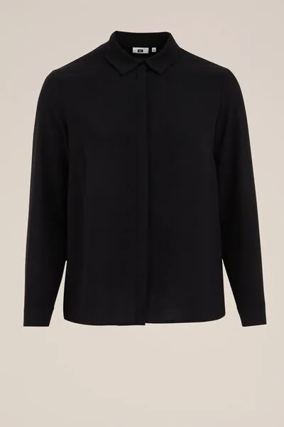 Deze regular fit blouse van gerecycled polyester heeft een blinde knoopsluiting, geweven stretch en lange mouwen met manchetten, welke voorzien zijn van een knoopsluiting.