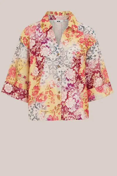 Upgrade jouw garderobe. Deze blouse heeft een regular fit met een kraag en een V-hals met knoopsluiting. De korte mouwen zorgen voor een luchtige uitstraling. De soepelvallende stof en de opvallende multikleur bloemenprint geven het model een frisse, vrouwelijke look.