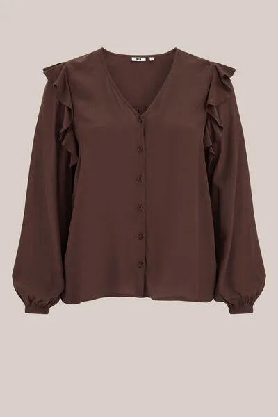 WE Fashion – Dames blouse met ruches – Curve – Regular fit – Donkerbruin – LENZING™ ECOVERO™ viscose – Plus Size Prijzen