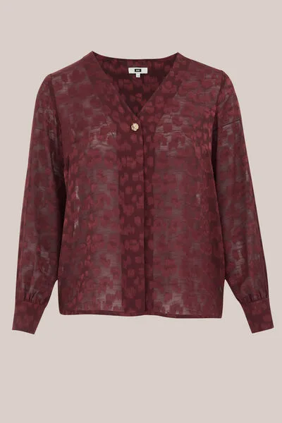 Subtiel speels, opvallend stijlvol. Deze blouse heeft een regular fit, een V-hals met een sierlijke gouden knoop, een blinde knoopsluiting daaronder en een all-over vlekjesprint in verschillende formaten met glanzend garen en voelbare structuur.