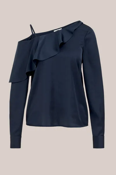Modern, stijlvol en romantisch. Deze blouse heeft een regular fit, een asymmetrisch design met schouderbandje, lange mouwen met knoopsluiting en subtiel ruches langs de halslijn.